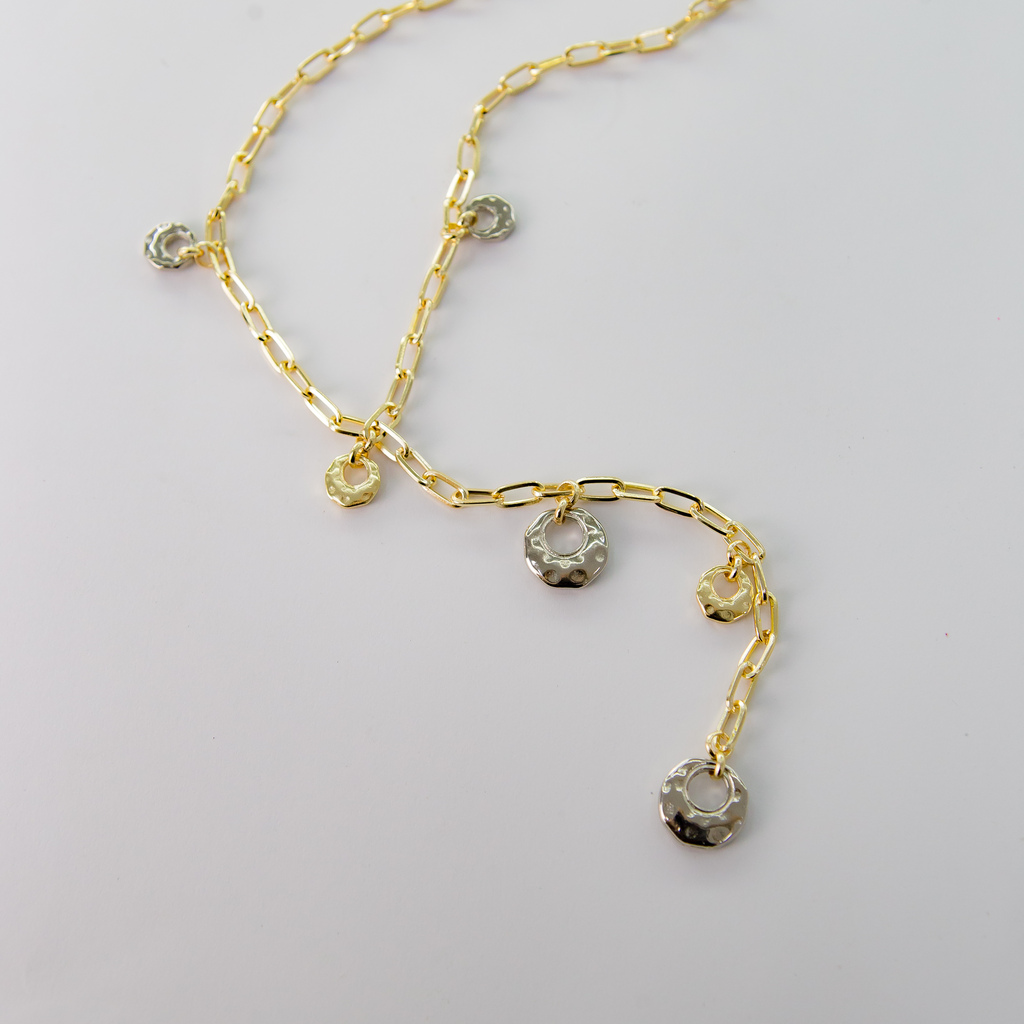 O Colar Esferas Mix de Banhos é a definição de elegância contemporânea. Suas esferas delicadas em banho dourado com verniz italiano premium criam um jogo de luz sutil e sofisticado, perfeito para composições modernas e versáteis.