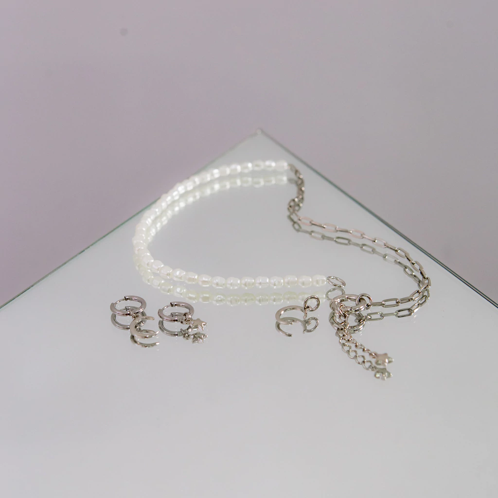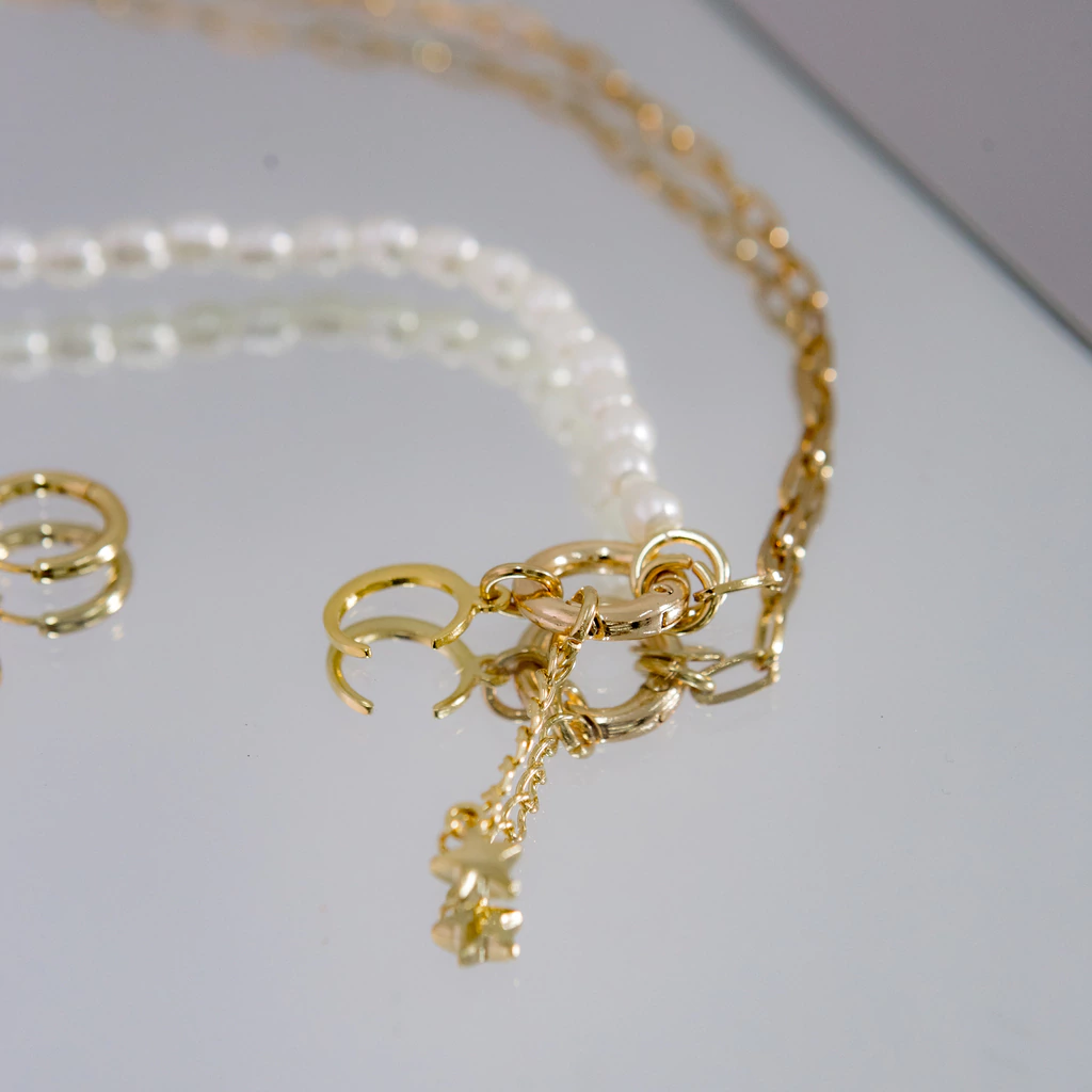 Colar meio a meio com mini pérolas de um lado e corrente Cartier do outro, com fecho boia central e pingentes de lua e estrela.