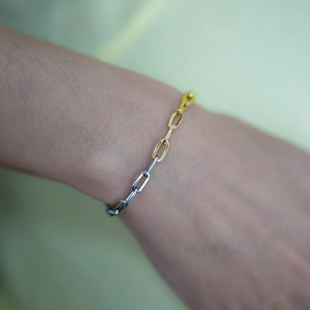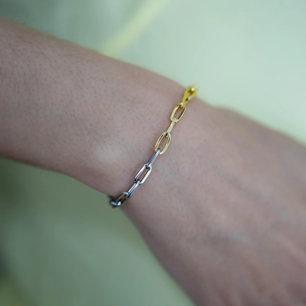 Com design marcante e estrutura elegante, a Pulseira Elos Mix de Banhos é uma joia que une tradição e modernidade. Seus elos interligados ganham destaque com o sofisticado mix de banhos — dourado e prateado em perfeita harmonia — criando uma estética versátil e cheia de personalidade. O acabamento em verniz italiano premium garante brilho espelhado e durabilidade impecável, enquanto o toque hipoalergênico oferece conforto absoluto para todos os estilos de pele.